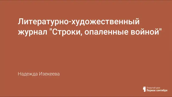 Литературно-художественный журнал "Строки, опаленные войной" рассчитан на восприятие учащихся 9–11-х классов. Он знакомит ребят-старшеклассников с биографией поэтов периода Великой Отечественной войны, воспитывает у них чувство патриотизма, гражданского долга, чувство любви к Родине.