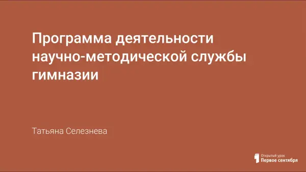 Одна из главных задач гимназического образования - создать условия для того, чтобы образование (процесс усвоения, изменения, развития и совершенствования знаний в течение всей жизни) стало потребностью, образом жизни каждого ученика и учителя. При этом гимназическое образование дает учащимся возможность жить в принципиально иной системе ценностей. Речь идет не о подготовке учащихся к некоей абстрактной жизни, а о включении их в особый образ жизни гимназии, где происходит формирование личности, усвоение принятых социально значимых ценностей, а также самоактуализация и социализация школьников. Особое место в гимназическом образовании занимает научно-методическая служба, программа деятельности которой представлена в данной статье.