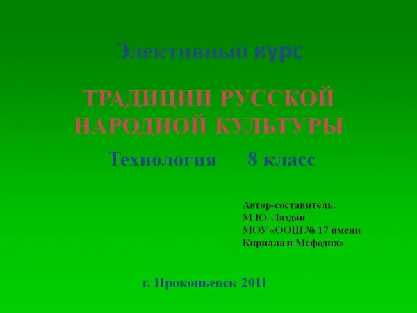 Программа элективного курса «Традиции русской народной культуры», представляет собой надпредметный курс, предназначенный для учащихся 8-го класса. Учащиеся не только приобретут знания по русской народной культуре, но и приобретут умения и навыки в процессе изготовления изделий.