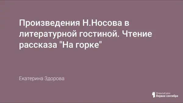 Задачи занятия: закрепить знания детей о знакомых произведениях Н.Носова; познакомить детей с новым произведением Н.Носова «На горке»; учить давать характеристику герою; обогащать речь детей.