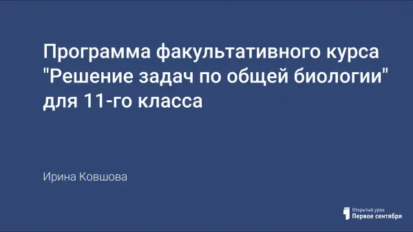 Программа ориентирована на учащихся 11-го класса общеобразовательных школ и направлена на дополнение базовых знаний по биологии. Цель курса – обеспечение компетентности выпускника в области генетики, молекулярной биологии и эволюционной теории и развитие у обучающихся практических навыков решения биологических задач.