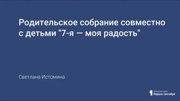 "7-я — моя радость" — родительское собрание совместно с детьми, которое способствует сближению и взаимопониманию между детьми и родителями. Через совместную деятельность участников родительского собрания, через использование пословиц, стихотворных произведений.