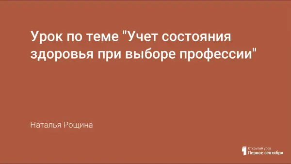 Автор работы дает определение понятию "здоровье", раскрывает взаимосвязь здоровья и выбора профессии, объясняет необходимость учета состояния своего здоровья при выборе профессии, использует разнообразные формы и методы закрепления и проверки знаний учащихся.