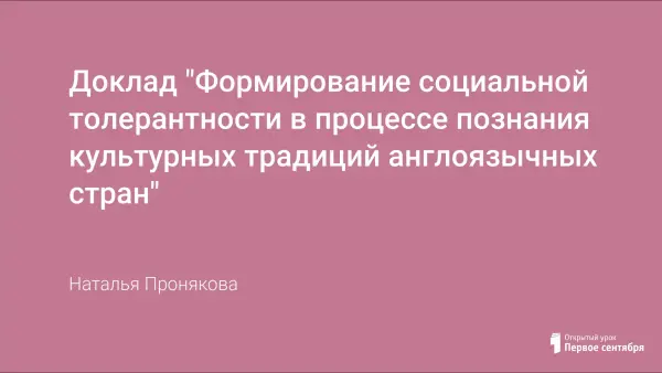 Доклад представляет описание работы по воспитанию толерантности на уроках английского языка в современной школе. В нем рассматриваются методы организации работы по данной проблеме на всех этапах обучения, обозначены вопросы, обсуждаемые на уроках, приведены примерные темы различных видов работ.