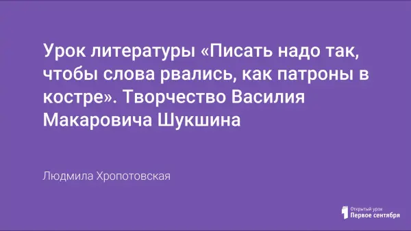 Цели урока: познакомить с жизнью и творчеством В.М.Шукшина, писателя, драматурга; показать лучшие нравственные качества русского народа, которые видел Шукшин, сам впитал в детстве, показал в произведениях; развить творческие способности учащихся, учить выразительному чтению, умению инсценировать текст; воспитывать нравственные качества: доброту, трудолюбие, любовь к малой родине.