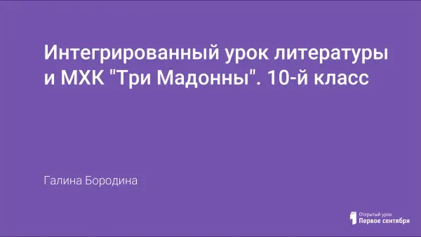 Урок посвящен трем шедеврам мирового искусства: «Сикстинская Мадонна» Рафаэля Санти, «Джоконда» Леонардо да Винчи, «Мадонна» А.С. Пушкина. Цель урока: познакомить учащихся с периодом Возрождения в Италии и его представителями; анализ стихотворения А.С. Пушкина при сопоставлении культуры эпохи Возрождения и Золотого века литературы; развитие умения видеть и чувствовать красоту человеческой души.