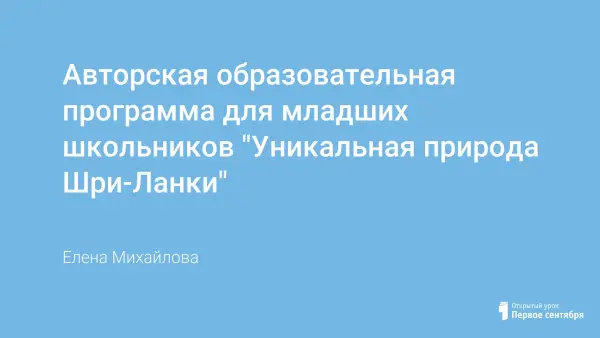 Данная программа реализуется в рамках экологического кружка "Олененок" начальной школы при Посольстве РФ в Шри-Ланке. Данная образовательная программа поможет младшему школьнику, посещающему школу в необычной для себя обстановке – в другой стране, быстрее адаптироваться к непривычным для себя условиям, а также научит ценить красоту природы различных стран.