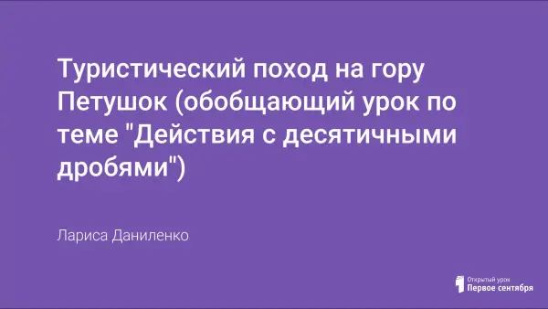 Обобщающий урок математики в 5-м классе в форме игры-путешествия, представляющей поход на гору Петушок. Цели урока: повторить данный материал; работать над повышением интереса к предмету; выработать навыки планирования действий, умение слаженно работать группой; научить находить ошибки товарищей и исправлять их.