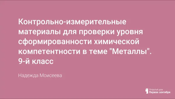 Представлены контрольно-измерительные материалы, позволяющие оценить уровень сформированности химической компетентности на содержании темы "Металлы" в 9-м классе.