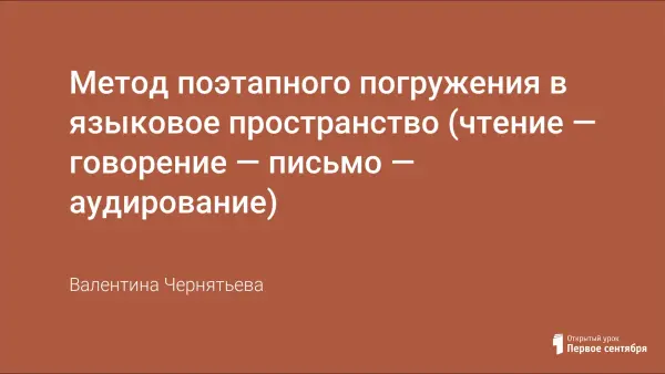 В статье описан авторский метод преподавания иностранного языка. Метод поэтапного погружения в языковое пространство не идет вразрез с общепринятой методикой, но имеет некоторые преимущества в направлении решения ряда дидактических задач.