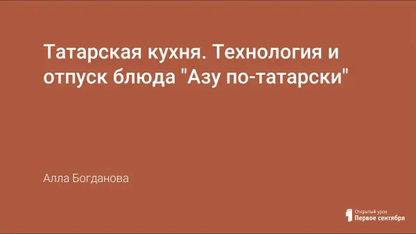 Презентация выпускной работы демонстрирует ассортимент блюд татарской кухни, историю ее становления и традиции. Раскрывает технологию приготовления и отпуска блюда «Азу по-татарски».