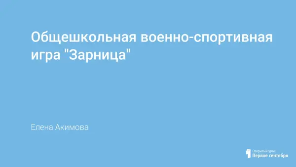 Общешкольная военно-спортивная игра «Зарница» проводится с целью реализации общешкольной программы патриотического воспитания; сохранения воинских традиций; пропаганды здорового образа жизни; осуществления комплексных мер по подготовке молодёжи к службе в Вооружённых силах России.