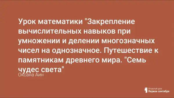 Представлен урок математики с элементами окружающего мира и литературы с использованием информационных технологий. Дети на уроке не только повторяют алгоритм деления многозначного числа на однозначное, но и обогащают знания об исторических памятниках, известных под названием «Семь чудес света».