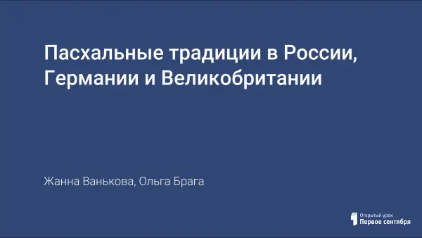 Данное внеклассное мероприятие знакомит учащихся с пасхальными традициями в России, Германии и Великобритании. Учащиеся сообщают друг другу об истории празднования Пасхи в вышеуказанных странах.