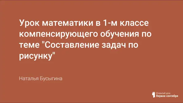 Данный урок проводится в 1-м классе компенсирующего обучения по учебнику "Математика" М.И. Моро (учебно-методический комплект "Школа России"). Целью урока является формирование умения составлять задачи по рисунку и решать их. На уроке используются коррекционно-развивающие упражнения, применяются здоровьесберегающие технологии.