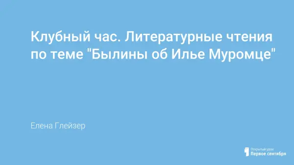 Этот клубный час ставит своей целью познакомить учащихся с былинами, в частности с былинами об Илье Муромце, сформировать умение отличать былину от других жанров литературы, создать условия для воспитания чувства патриотизма, гордости за свой народ.