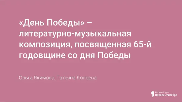 Литературно-музыкальная композиция представлена в исполнении учеников старших классов. В ней выражен взгляд современного молодого поколения на подвиг русского солдата. Звучат слова благодарности в адрес ветеранов Великой Отечественной войны. Завершается композиция словами о мире и недопустимости повторения общечеловеческой трагедии.