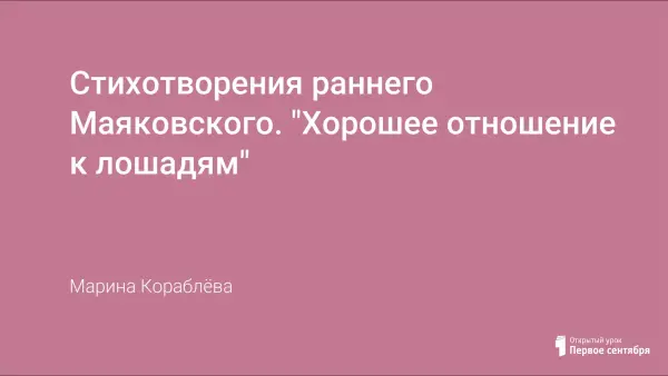 На основе материала урока подвести учащихся к пониманию художественного своеобразия раннего периода творчества В.В. Маяковского. Учащиеся не только анализируют поэтический текст, делают обобщения, но и строят алгоритм образа, скрытого в стихотворении, раскрывают гуманистический пафос стихотворения «Хорошее отношение к лошадям».