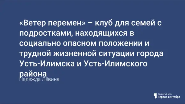 «Ветер перемен» – клуб для семей с подростками, находящихся в социально опасном положении и трудной жизненной ситуации города Усть-Илимска и Усть-Илимского района