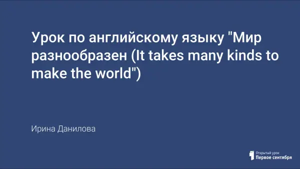 Урок «It takes many kinds to make the world» (Мир разнообразен) проводился в 7-м классе при изучения одноименной темы с целью обобщения и закрепления тематической лексики, развития умений и навыков всех видов речевой деятельности.