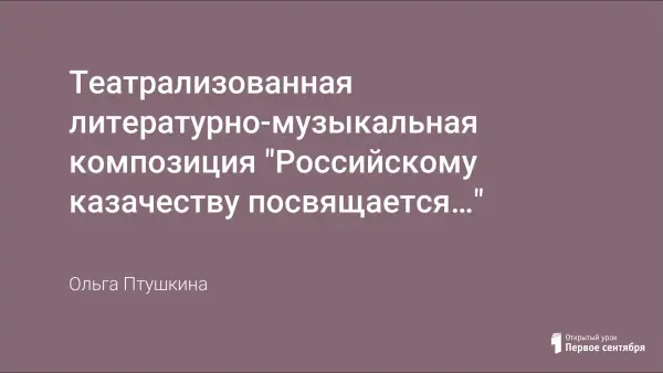 Предлагаемая театрализованная литературно-музыкальная композиция направлена на приобщение младших школьников к культурным богатствам русского народа, патриотическое и нравственное воспитание на примере героических страниц русской истории. Широкое привлечение народной музыки помогает детям проявить исполнительское мастерство, передать особую лихость, силу, стройность казачьей песни.