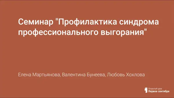 На семинаре рассматривался вопрос - что означает термин "синдром профессионального выгорания"? Какие бывают симптомы профессионального выгорания (эмоциональное выгорание, деперсонализация, тревога и депрессия), а также фазы развития "профессионального выгорания" и факторы вызывающие этот синдром. Даны практические рекомендации по профилактике синдрома "профессионального выгорания" для педагогов.