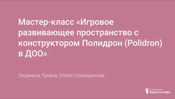 Цель занятия: демонстрация опыта работы по познавательному развитию дошкольников. Задачи: повышение профессиональной компетентности педагогов в вопросах развития конструктивных способностей и технического мышления, поиском концептуально новых подходов, методов и приемов работы в познавательной деятельности дошкольников; расширение представления педагогов об особенностях и функциональных возможностях игрового оборудования «Полидрон»; осуществление индивидуального подхода по отношению к каждому участнику мастер-класса, отслеживание позитивных результатов деятельности каждого педагога; создание ситуации успешности и положительных взаимоотношений в группе.