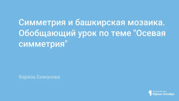 В настоящей статье предлагаем урок, который создавался вместе с учениками 8-го класса, по теме:«Осевая симметрия». Целью данного урока является формирование понятия о симметрии и умения видеть явления симметрии в окружающем мире, в том числе в башкирских орнаментах. Этот урок показывает практическое применение осевой симметрии в жизни, поэтому его можно проводить в 5-6-х классах как кружковое занятие.