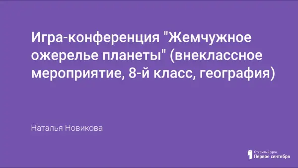 Главная цель данного мероприятия: совершенствование и углубление знаний об озерах мира, воспитание бережного отношения к родной природе. Проведено оно во время предметной недели. Данное внеклассное мероприятие рассчитано на учащихся 8-х классов и проходит в форме игры с разнообразными конкурсами.
