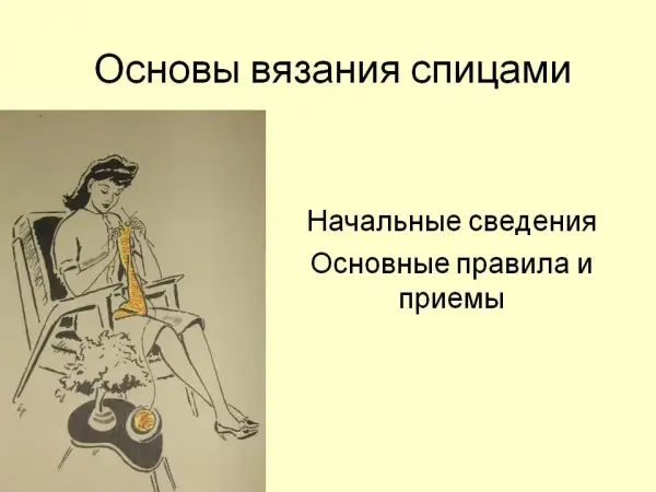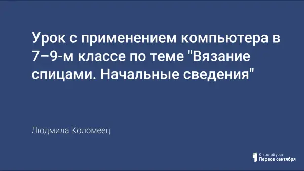 На занятии учащиеся знакомятся с инструментами и материалами, необходимыми для вязания спицами, получают представление и формируют понятие о наборе петель на спицы, о вязании лицевых и изнаночных петель. Занятие формирует первичный навык набора петель и вязания лицевых и изнаночных петель в практической работе.