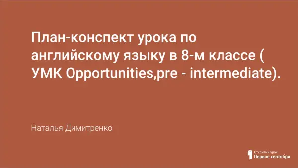 Данная статья содержит план урока по учебнику Opportunities уровень pre-intermediate. В работе выделяется цель, задачи и подробно расписывается структура урока, приводится фотография урока, а также анализ уже проведенного урока по предлагаемой схеме в 8-м классе.