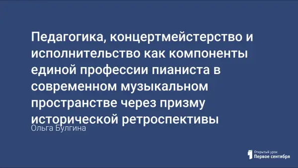 Педагогика, концертмейстерство и исполнительство как компоненты единой профессии пианиста в современном музыкальном пространстве через призму исторической ретроспективы. Пианизм включает в себя целый комплекс предметных областей и видов деятельности. В процессе эволюции менялись инструменты, их технические возможности, соответственно менялись и все аспекты пианизма. Объединяющим фактором во все времена остается универсальность профессии пианиста, ее полифункциональность.