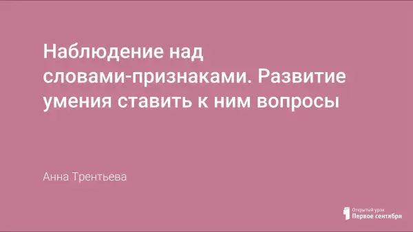 В статье представлен конспект метапредметного урока по русскому языку во 2-м классе на тему «Наблюдение над словами-признаками». В ходе урока применялись разнообразные методы, направленные на совершенствование умений и навыков учащихся, на развитие речи и мышления второклассников. Содержание урока построено на одной «сквозной» линии «Осень», которая объединяет все этапы, каждый из которых связан логически и тематически.