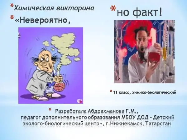 Химическая викторина рассчитана для учащихся 11-х классов химико-биологического профиля обучения и расширяет знания по химии, межпредметную интеграцию знаний по химии, физике, биологии, экологии, медицине, истории. Проходит в форме путешествия по станциям «Цветочная», «Любознательная», «Физическая», «Строительная», «Коррозионностойкая», «Ботаническая», «Историческая», «Биохимическая», «Ученые-химики». Учитываются глубина знаний, остроумие, находчивость, оригинальность ответов.