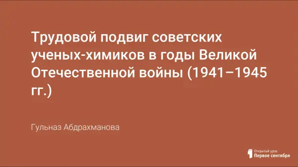 Внеклассное мероприятие «Трудовой подвиг советских ученых-химиков в годы Великой Отечественной войны (1941–1945 гг.)». Цель: формирование у обучающихся высокого патриотического сознания с усвоением новых знаний по данной теме. Рассмотрен вклад выдающихся советских ученых-химиков в годы Великой Отечественной войны. Тип мероприятия – комбинированный, формы: лекция, беседа, презентация, круглый стол. Использована межпредметная интеграции знаний (химия, физика, биология, география, история).