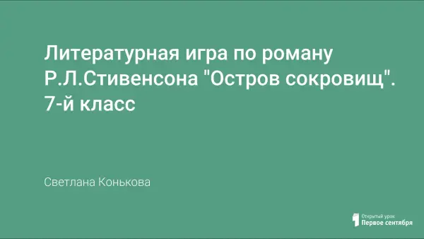 Данный урок представляет собой литературную игру для 7-х классов по роману Р.Л.Стивенсона «Остров сокровищ». Автором сформулированы цели игры, представлены конкурсные задания, включена презентация. Для победы необходимо пройти пять конкурсов.