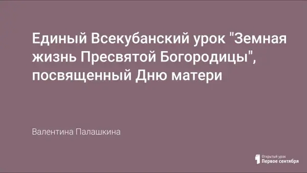Урок проведен в рамках месячника, посвященного празднованию Дня матери в России, для девушек 10–11-х классов. На уроке ученицы знакомятся с земной жизнью Пресвятой Богородицы; изучают смиренный подвиг Пресвятой Богородицы.
