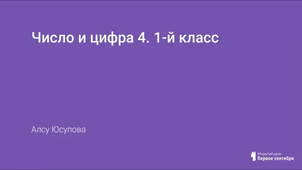 Урок открытия новых знаний, знакомство с числом и цифрой 4, без анализа аддитивного состава числа 4. Формирование понятия «четвертый», отличие количественного смысла числа 4 от порядкового числительного «четвертый». Использовались проблемный и деятельностный методы с целью развития логического мышления и мотивации. Развитие математической речи, работа в парах, ориентация на партнера по общению, взаимоконтроль и взаимопомощь, самоорганизация, формирование внутренней позиции школьника.