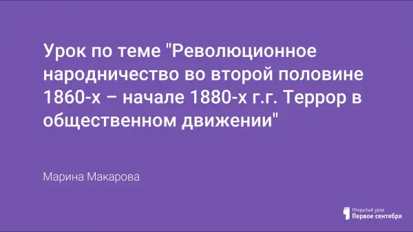 На уроке изучается тактика народников, раскрываются суть, формы революционного террора, причины краха революционного народничества. Развиваются умения характеризовать разновидности леворадикальной идеологии (народничество), раскрывать эволюцию политических радикальных течений, давать оценку деятельности их представителей, анализировать, делать выводы.