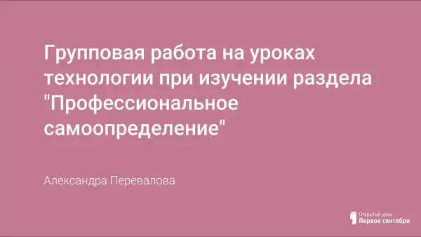В данной работе приводятся примеры групповой работы и игровой деятельности на уроках технологии, применение которых помогает усвоению и закреплению понятий, способствует развитию интереса к изучаемому предмету, развивает воображение и смекалку, помогает укрепить межличностные взаимоотношения. Практическая часть позволяет работать с профессиограммами и формирует готовность к самостоятельному выбору профессии.
