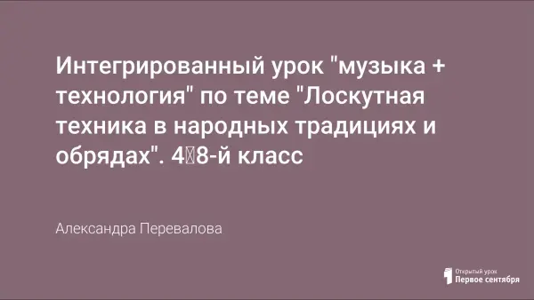Цель урока: раскрытие творческого потенциала учащихся в познании народного творчества; изучение обычаев, обрядов и традиций русского народа; исполнение народных песен; знакомство с разнообразием декоративно-прикладного творчества и разучивание народной игры «Я веселая ткачиха». Предусмотрена практическая работа по выполнению лоскутного одеяла.