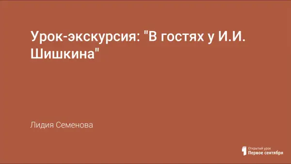 Урок-экскурсия посвящен творчеству И.И. Шишкина. Он был приурочен к знаменательной дате – 175-летию со дня рождения художника. Дети узнают о детстве И. Шишкина, о годах учебы в Москве, затем в Петербургской академии художеств, о заграничной поездке в Берлин. Дети учатся "читать" картины, рассуждать над ними. Урок расширяет кругозор учащихся, воспитывает любовь к природе, к окружающему миру, учит видеть красоту и беречь ее.