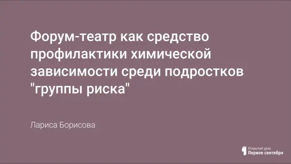 Статья автора посвящена профилактике химической зависимости среди подростков "группы риска". Интерактивные формы ‒ развивающие занятия "Навыки жизни" и форум-театр. Автор делится своим опытом применения этих форм в школьной жизни. Универсальность этой технологии заключается в том, что она может быть использована как самостоятельная форма работы с подростками, так и включаться в общую систему работы со всеми подростками школы по профилактике химической зависимости.