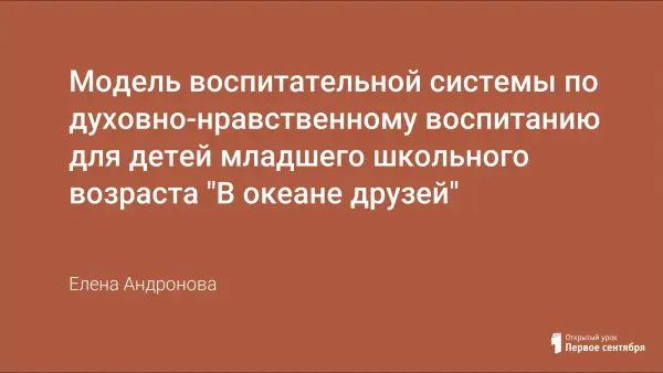 Статья содержит разработанную и апробированную модель воспитательной системы по духовно-нравственному воспитанию для детей младшего школьного возраста "В океане друзей", целью которой является: воспитание самодостаточной творческой личности ребёнка, способной строить жизнь, достойную человека через ценностное отношение к окружающему миру.
