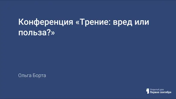 Конференция проводится в декаду естественных наук. В занимательной форме знакомит учащихся с таким значимым физическим явлением природы, как трение, учитывается значение трения в быту и технике. Подготовка к конференции (поиск материала, его отбор и создание презентации) развивает аналитический склад ума, вырабатывает комплексное видение задачи и поиск оптимального решения к ней.