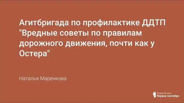 Материал направлен на профилактику ДДТТ. В занимательной форме, в стиле "вредных советов" Г.Остера рассказано о том, как детям нельзя себя вести на дороге, какие правила дорожного движения нужно выполнять, чтобы не попасть в ДТП. Рассказано о дорожных знаках и знаках светофора.