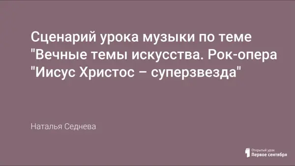 Разработанный урок в системе тематического планирования уроков музыки 7-го класса относится к разделу «Сюжеты и образы духовной музыки». Задачи урока: актуализировать музыкальный опыт семиклассников, связанный с образами духовной музыки; познакомить с фрагментами рок-оперы Э.Л. Уэббера; рассмотреть вопрос о традициях и новаторстве в жанре оперы.