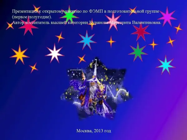 Цели урока: упражнять в счёте в пределах 10, в умении различать количественный и порядковый счёт в пределах 10; упражнять детей в умении сравнивать два числа, группы предметов; закрепить умение ориентироваться на прямой, применять ориентацию по направлению право – лево; потренировать детей в умении различать понятия: за – перед, выше – ниже, над – под; потренировать детей в умении различать простейшие геометрические фигуры; потренировать детей в умении решать простейшие арифметические задачи.