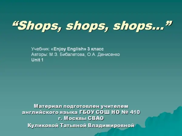 На уроке дети повторяют и закрепляют лексику и грамматику, учатся использовать конструкции «I/We/they would like to buy». Урок способствует развитию памяти, внимания и быстрой реакции.