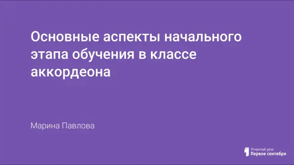 Начинать общение ребёнка с инструментом необходимо с первого занятия. На первом уроке ученик знакомится с внешним строением аккордеона (клавиши, кнопки, мех, различные ремешки, воздушный клапан), принципом звукообразования. Уже на первом занятии ученик, с помощью воздушного клапана, может начать делать упражнения на разжим и сжим меха. Для понимания принципа смены меха проводятся аналогии с дыханием человека: мех – это легкие, разжим – вдох, сжим – выдох.